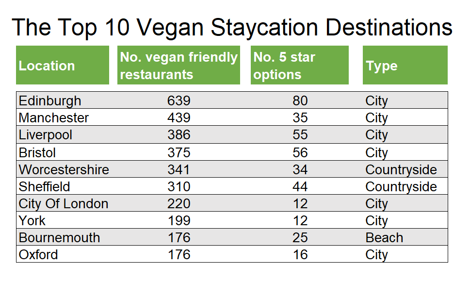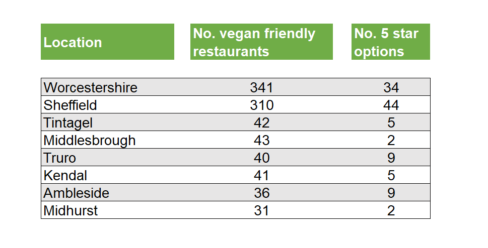 If you're looking for a countryside retreat Worcestershire is your best option, closely followed by Sheffield. We've included some real countryside staycations, these have fewer vegan options as you might imagine though.