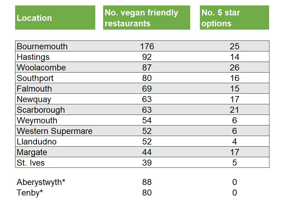 Whilst Tenby and Aberystwyth did have a good level of vegan options, none of the available places was rated as 5 stars at the time of writing so we didn't include them in our top spots.