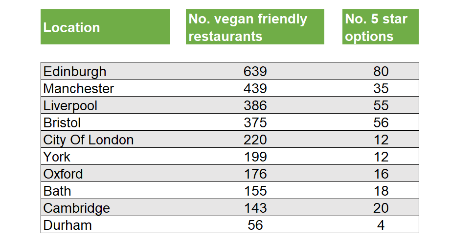 Edinburgh tops our list as the most vegan-friendly staycation destination in the UK. With over 350 vegan options available throughout this historic city, you're not going to lack choice. Added to that Edinburgh has the most 5-star rated restaurants that offer vegan-friendly food, so you know it's going to be good!