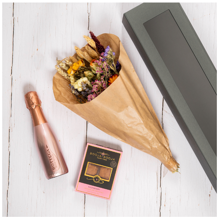 Nothing says I love you more than the classic duo of flowers and sweet treats! This beautiful gift of dried flowers, prosecco and mouth watering raspberry truffles is ideal for your loved one because it is all packaged together in a sophisticated eco friendly packaging.