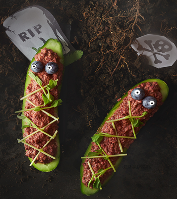 These spooky cucumber coffins are gluten free, nut-free, oil free but are light and tasty enough to provide the perfect film snack.